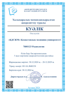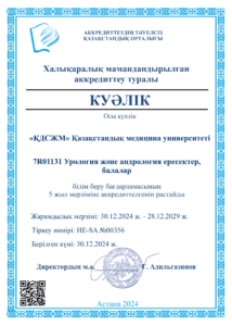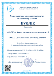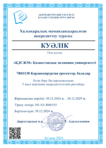 «ҚДСЖМ» Қазақстандық медицина университеті» ЖШС кәсіптік білім беру саласында білім беру қызметін жүргізу құқығына лицензиясы бар № KZ18LAA00006861 (мерзімсіз) 04.2016, сондай-ақ аккредиттеу туралы куәліктерге ие: Институционалдық аккредиттеу IA № 00035 25.05.2021 ж. – 24.05.2026 ж., Мамандандырылған аккредиттеу SA № 00058-63 25.05.2021 ж. – 24.05.2026 ж.