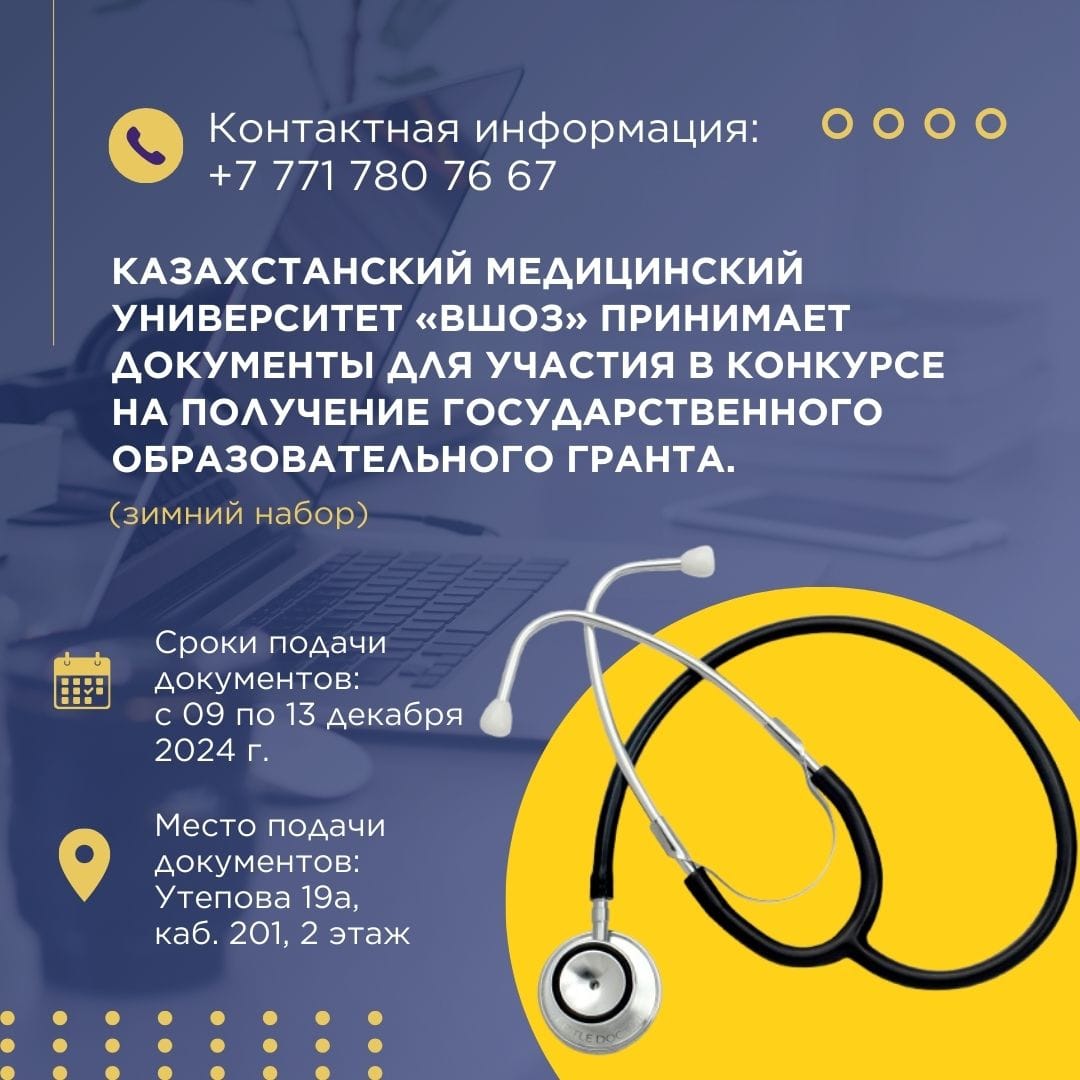 С 9 по 13 декабря Казахстанский медицинский университет «ВШОЗ» открывает прием документов для участия в конкурсе на присвоение государственного образовательного грантаСроки подачи документов: с 9 по 13 декабря 2024 г.Место подачи: Утепова 19а, каб. 201, 2 этажКонтактный телефон: 87717807667 Не упустите шанс стать частью нашей образовательной семьи!