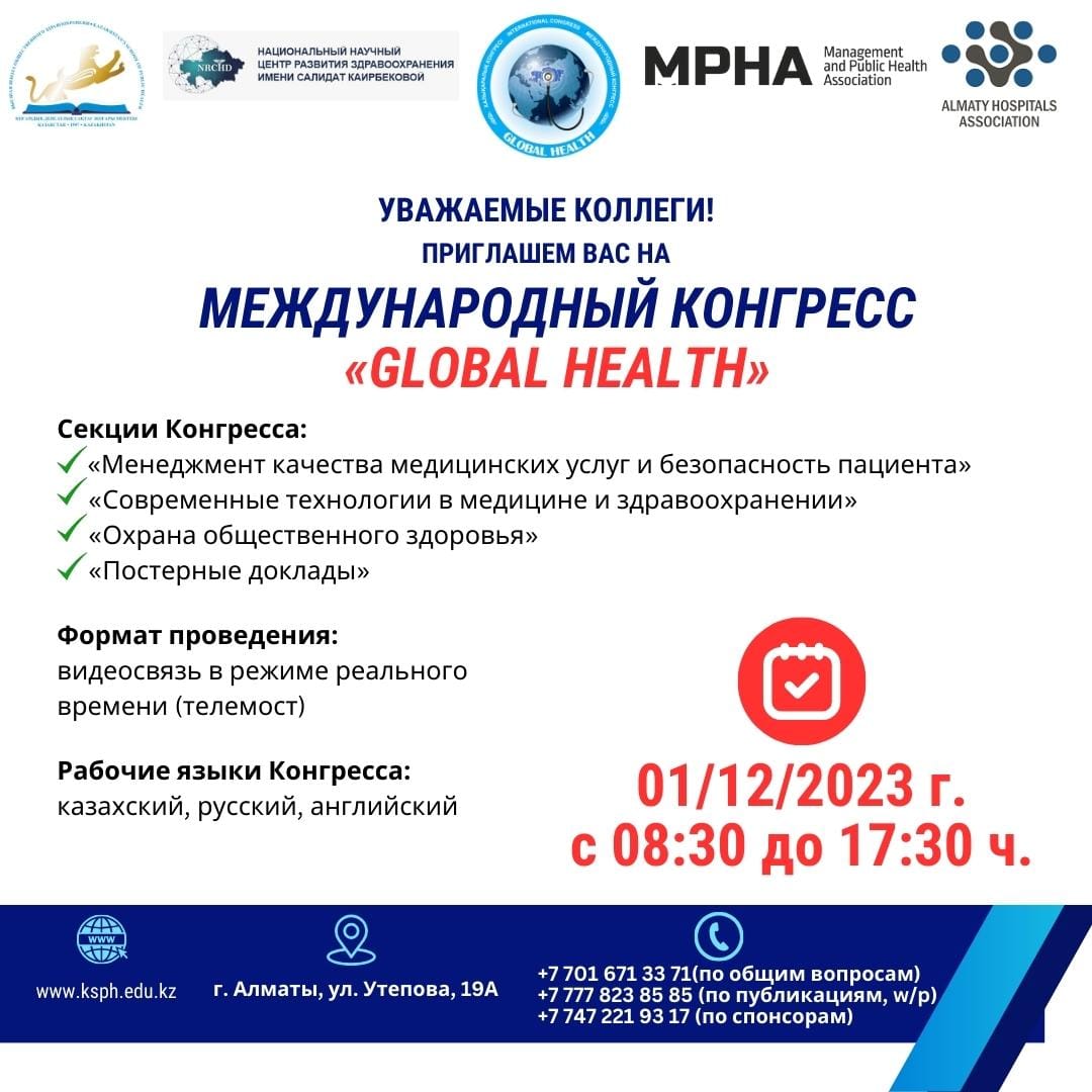 1 декабря 2023 г. Казахстанский медицинский университет «ВШОЗ» при поддержке Министерства здравоохранения Республики Казахстан совместно с Национальным научным центром развития здравоохранения имени Салидат Каирбековой, Ассоциацией менеджмента и общественного здравоохранения и Ассоциацией клиник г. Алматы приглашает всех принять участие в Международном Конгрессе «Global Health». Секции Конгресса: «Менеджмент качества медицинских услуг и безопасность пациента» «Современные технологии в медицине и здравоохранении» «Охрана общественного…
