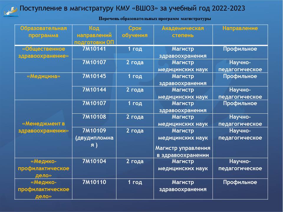 КМУ «ВШОЗ» сообщает об осуществлении приема в магистратуру в области здравоохранения на конкурсной основе по результатам комплексного тестирования. Конкурс на присуждение образовательных грантов для поступления в магистратуру будет проводиться до 20 августа 2022 года. Проходной балл для поступления в научно-педагогическую магистратуру по государственному образовательному заказу составляет 75 баллов. Зачисление лиц в научно-педагогическую магистратуру на платной основе осуществляется по итогам КТ…