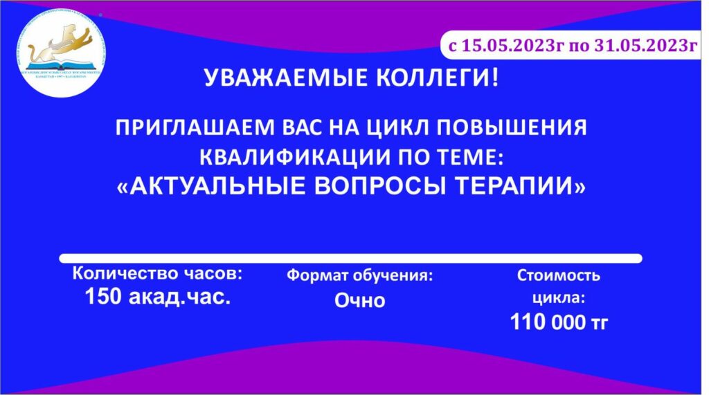 2. «Актуальные вопросы терапии», 150 академических часов, Стоимость – 110 000 тг. Дата: с 15.05.2023 г. – 31.05.2023 г. Формат – очно;