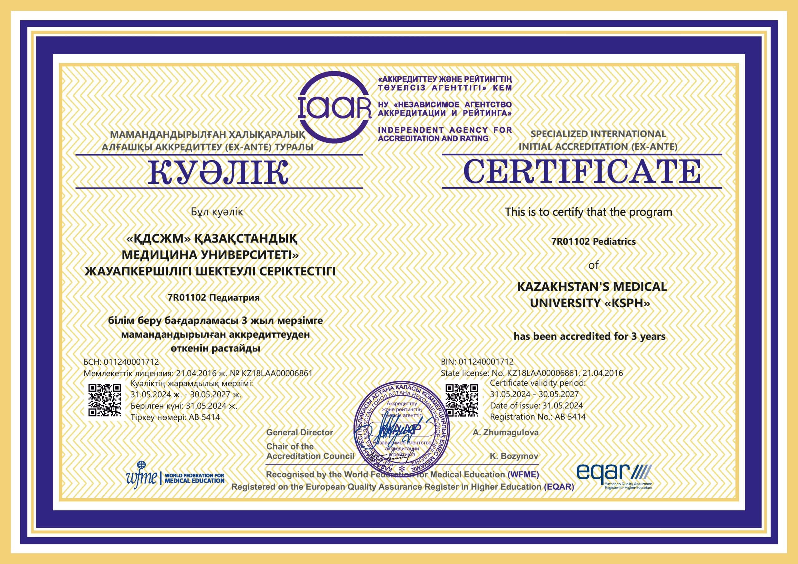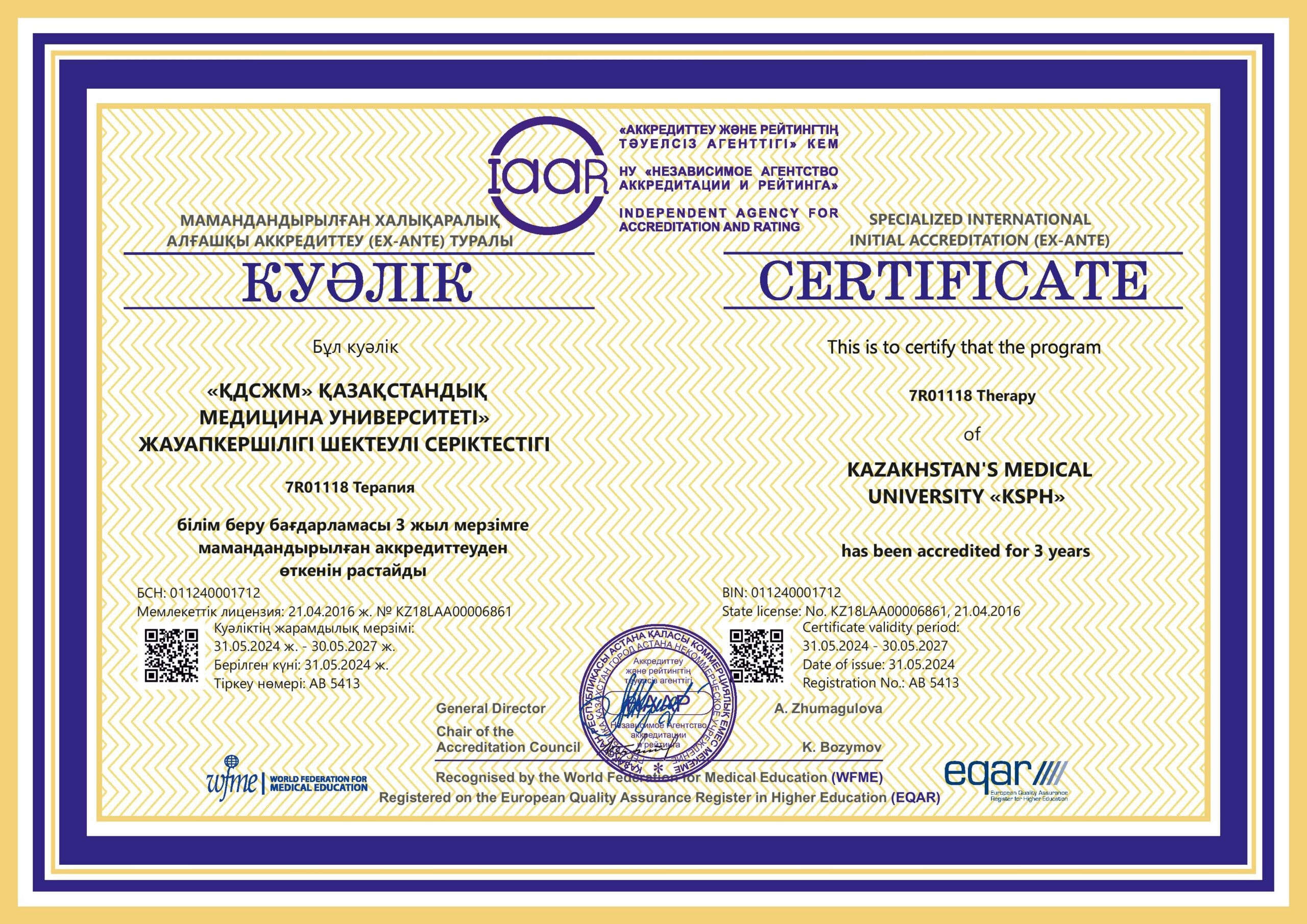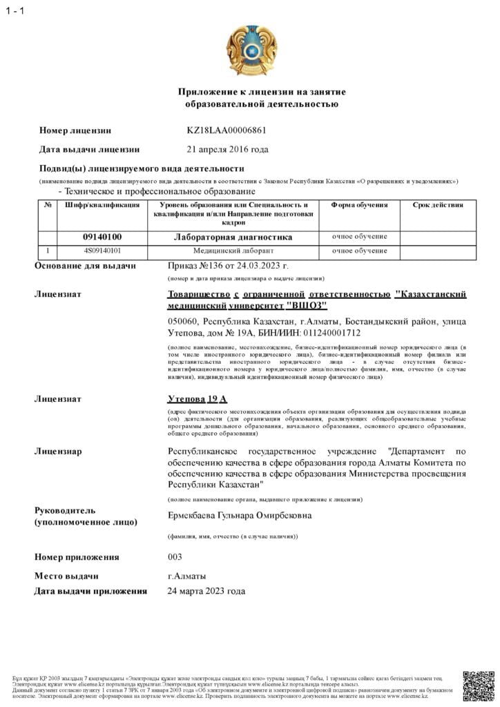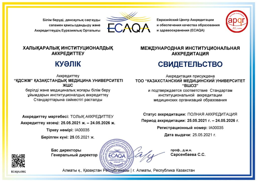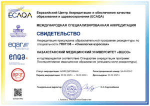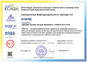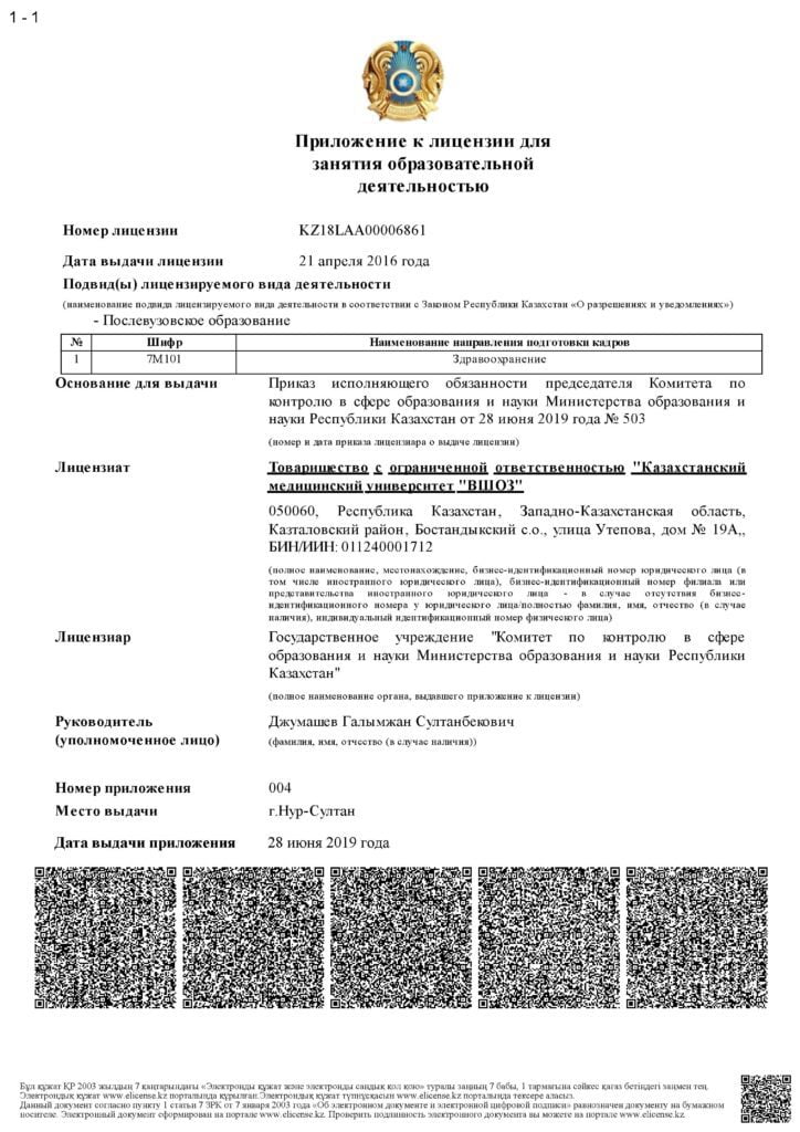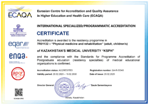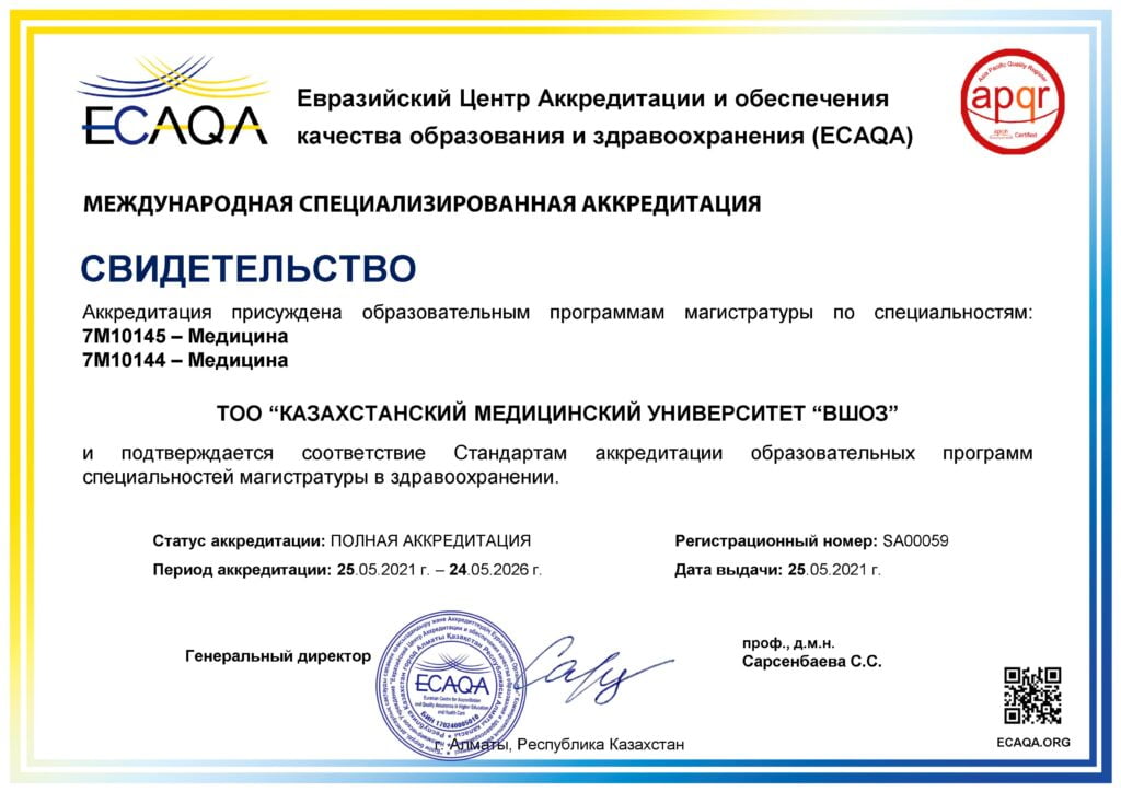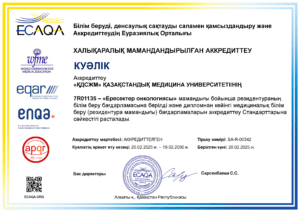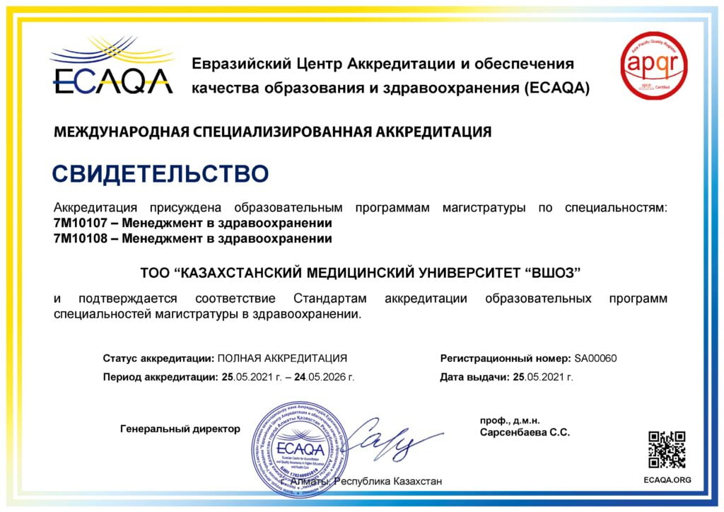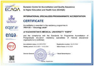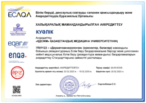 KMU «KSPH» has a license for the right to conduct educational activities in the field of vocational education no. KZ18LAA00006861 dated 21.04.2016 (indefinite), as well as certificates of accreditation: Institutional accreditation IA no. 00035 dated 25.05.2021 – 24.05.2026, Specialized accreditation SA no. 00058-63 dated 25.05.2021 – 24.05.2026.