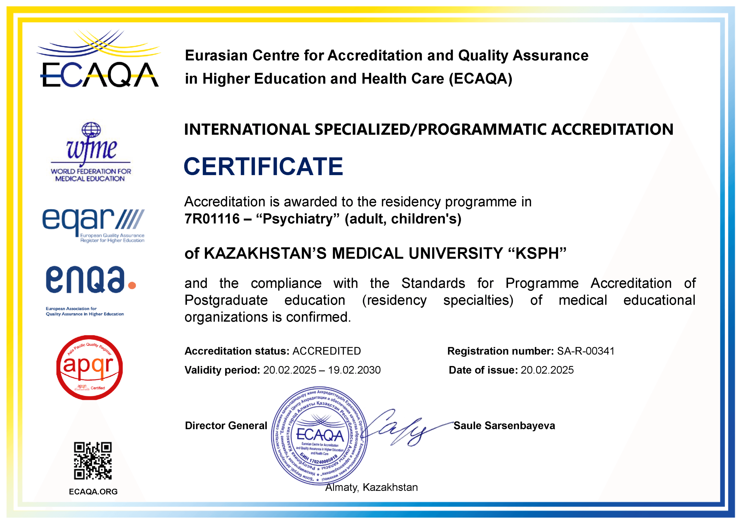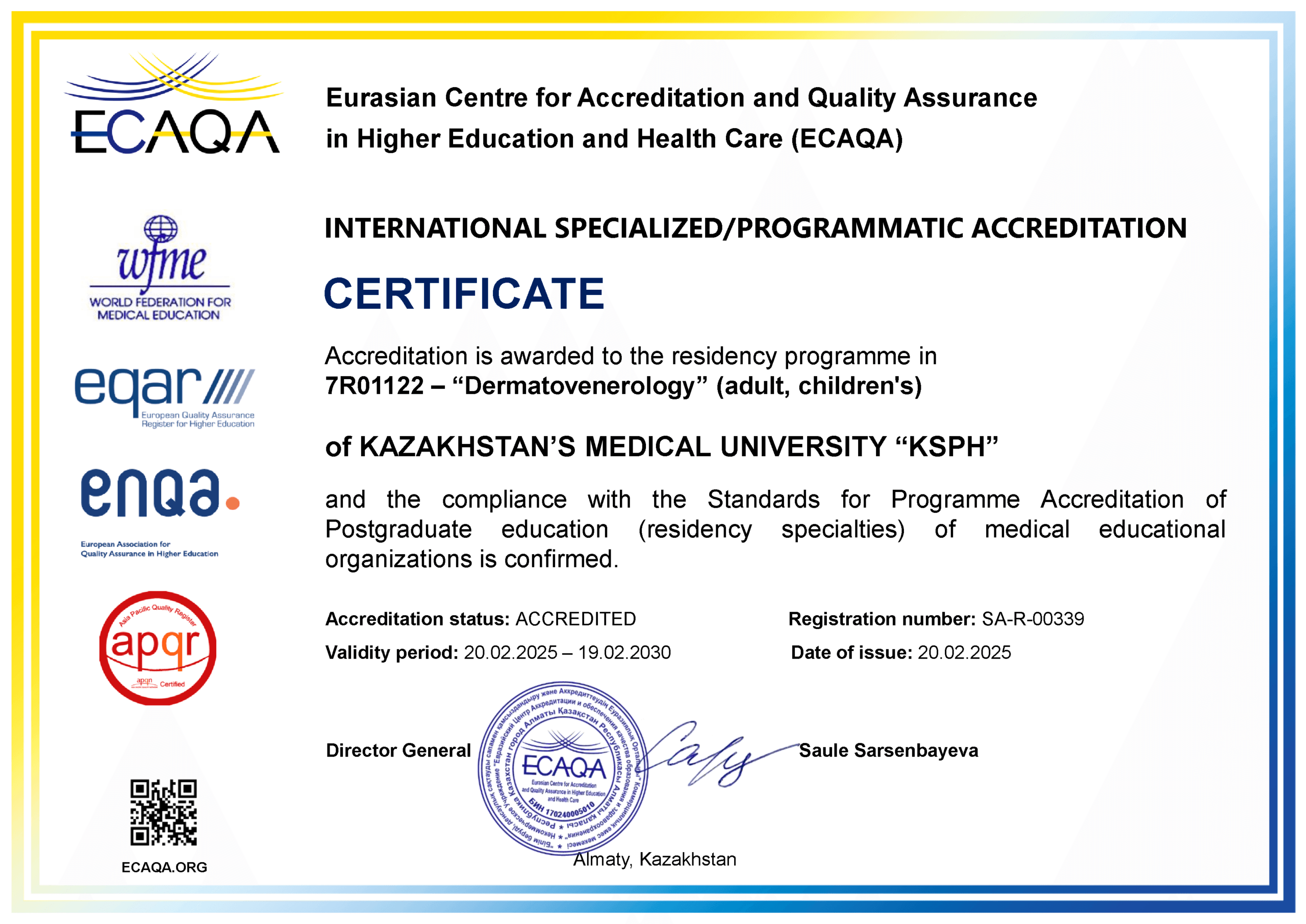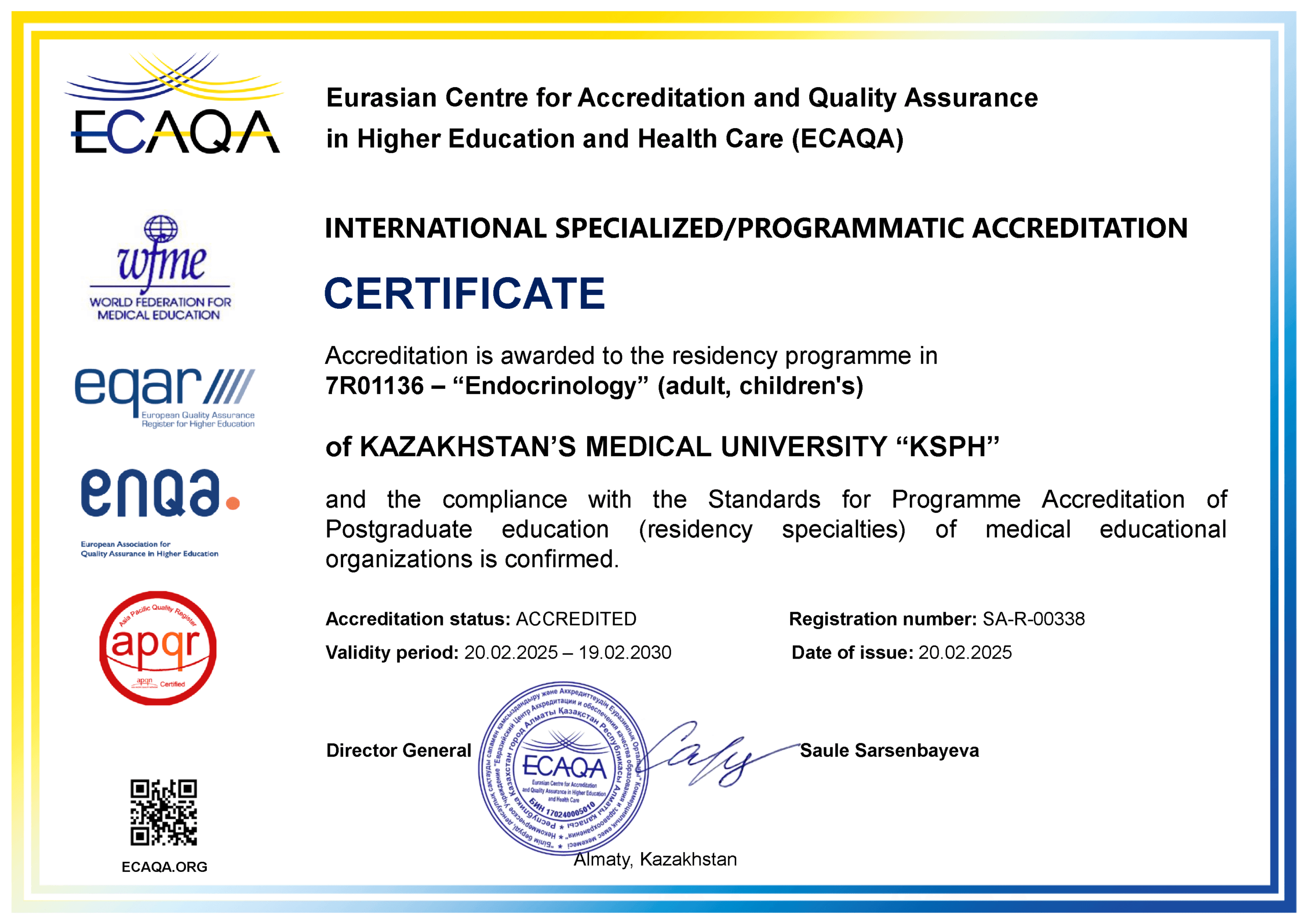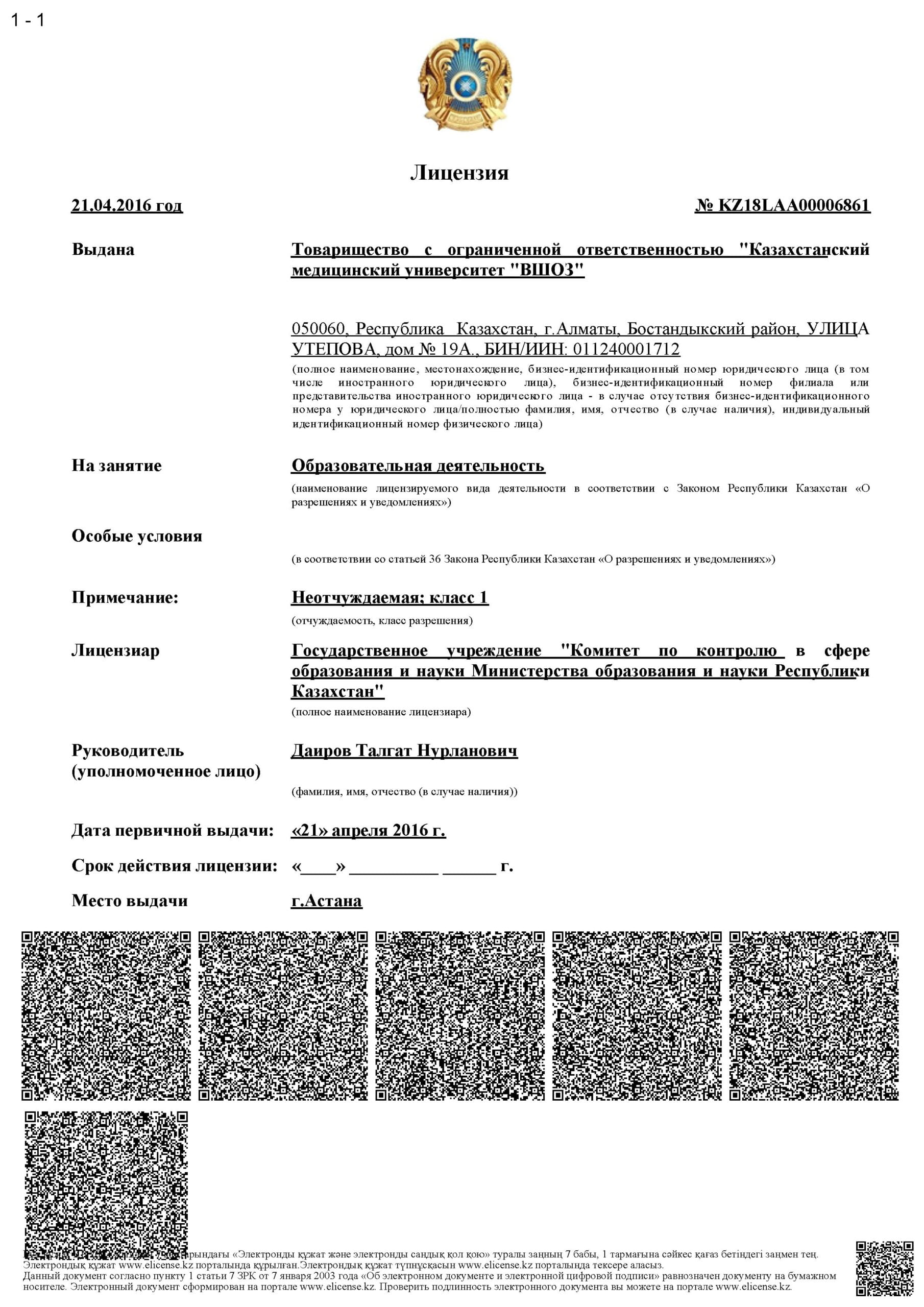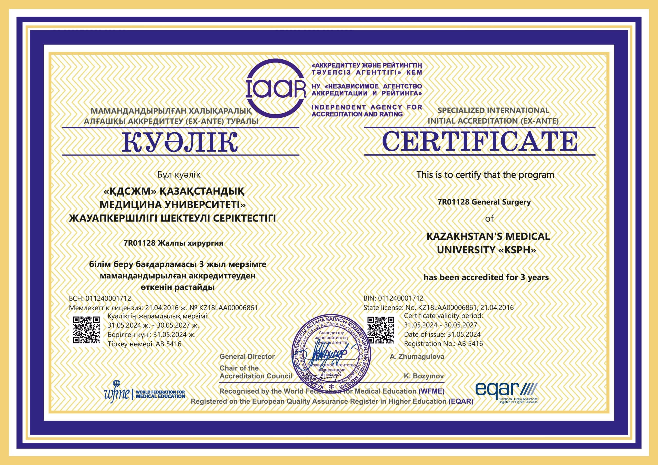 KMU «KSPH» has a license for the right to conduct educational activities in the field of vocational education no. KZ18LAA00006861 dated 21.04.2016 (indefinite), as well as certificates of accreditation: Institutional accreditation IA no. 00035 dated 25.05.2021 – 24.05.2026, Specialized accreditation SA no. 00058-63 dated 25.05.2021 – 24.05.2026.
