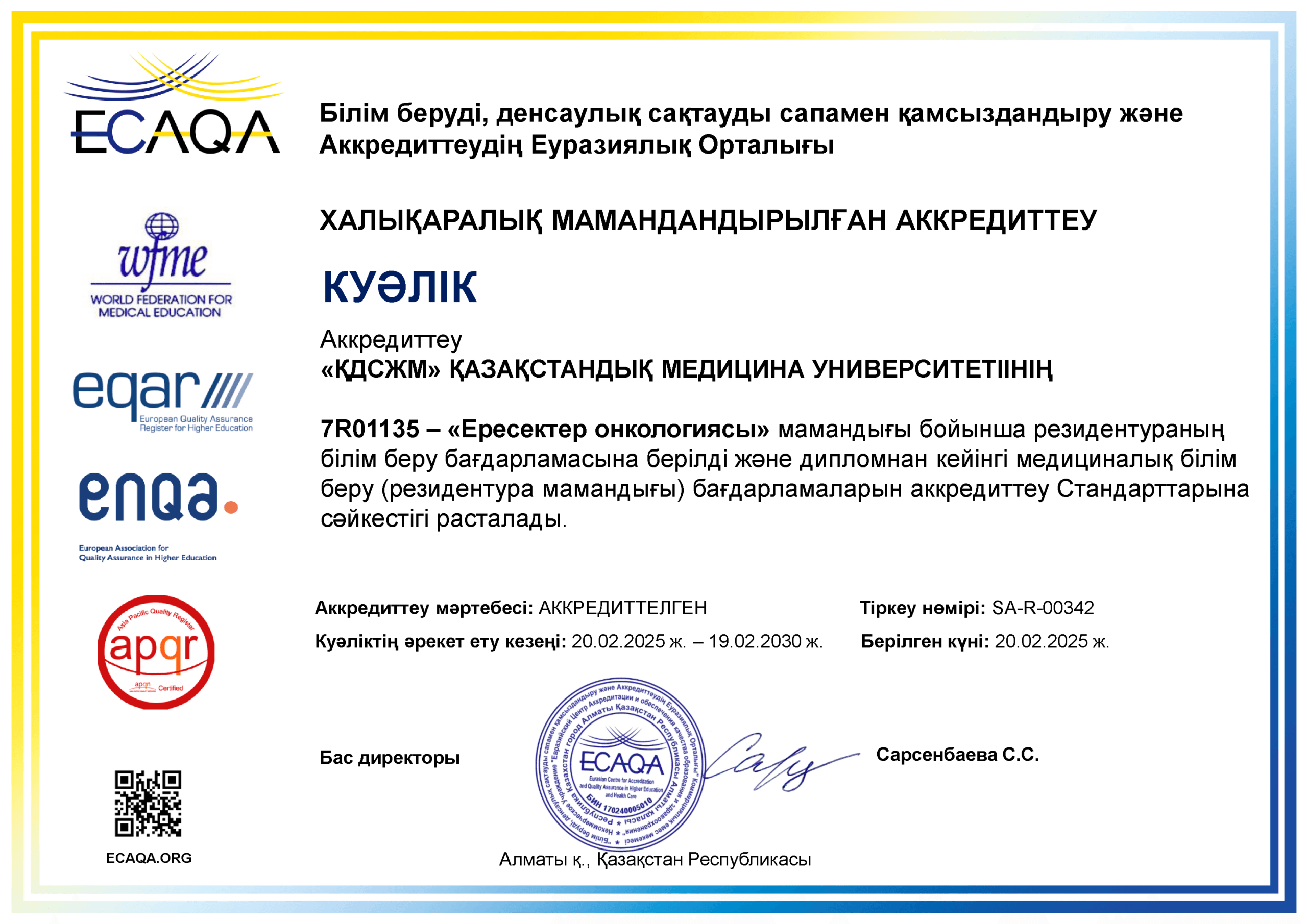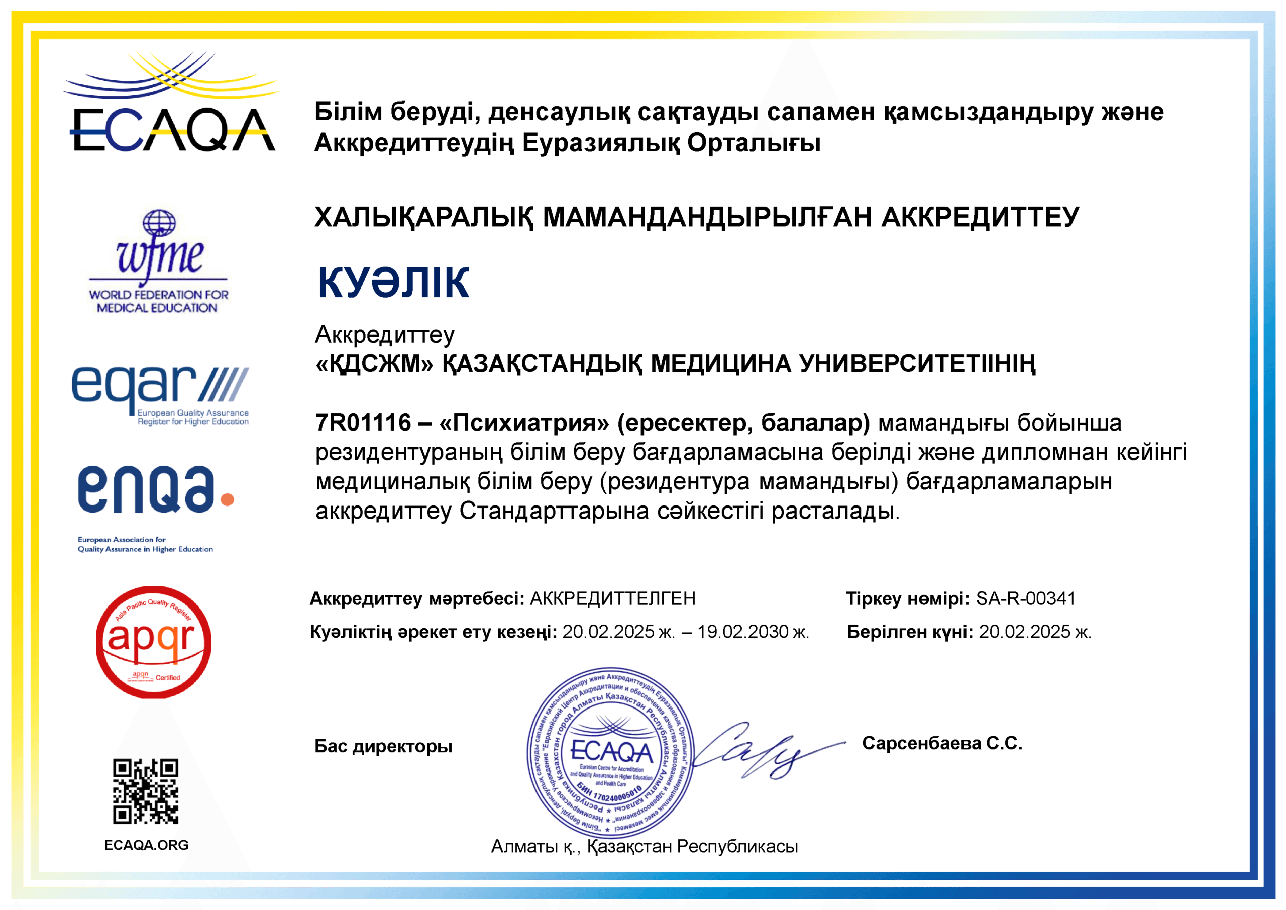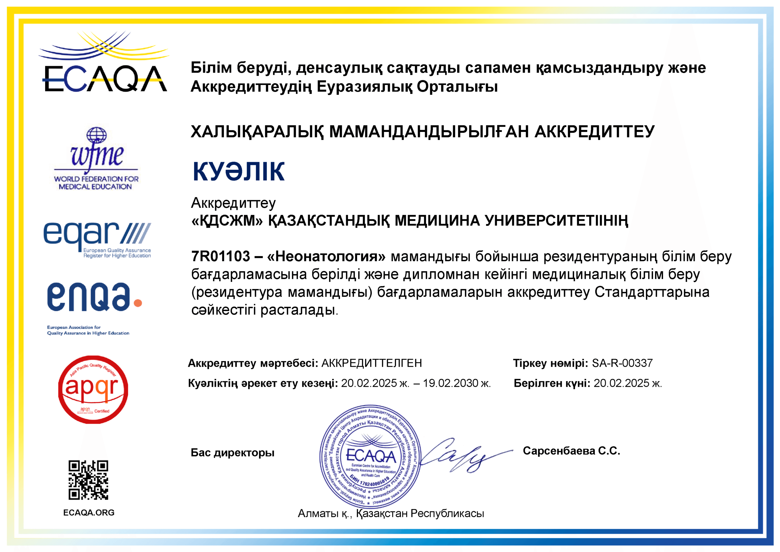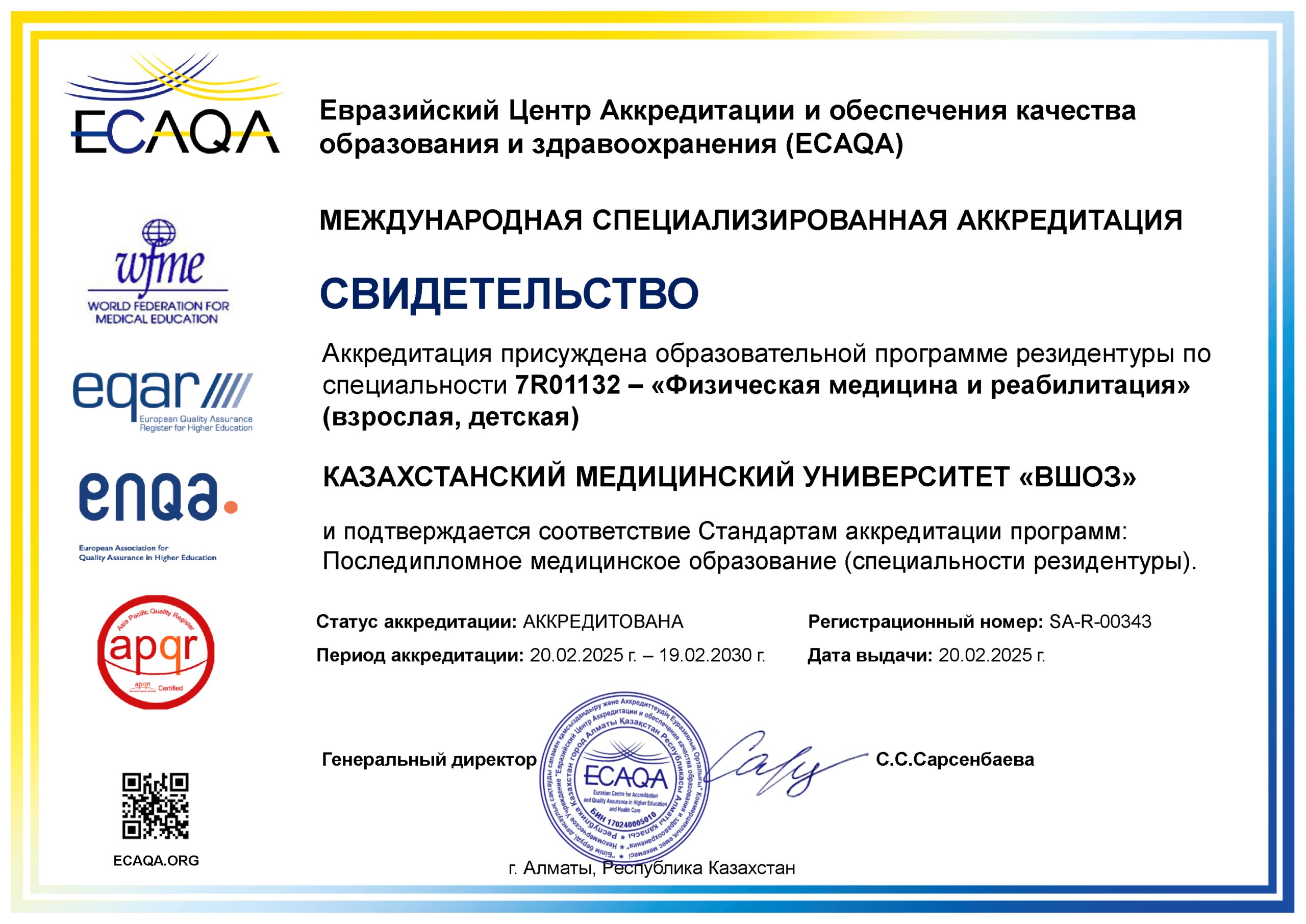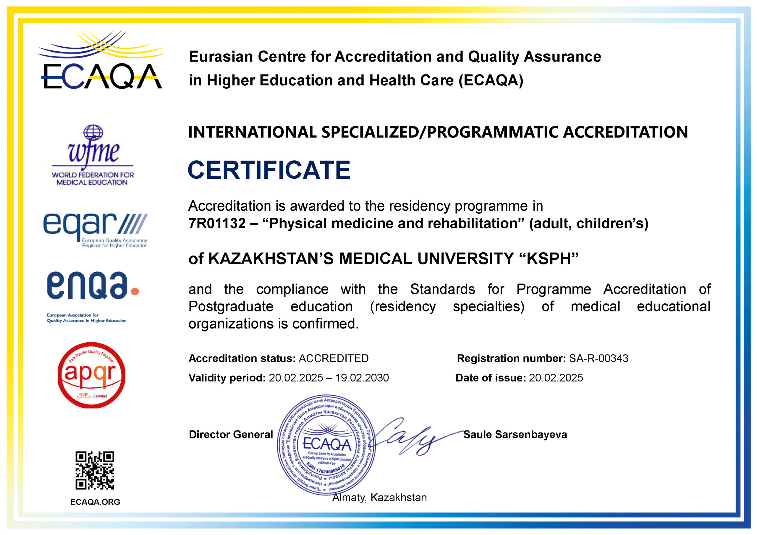 KMU «KSPH» has a license for the right to conduct educational activities in the field of vocational education no. KZ18LAA00006861 dated 21.04.2016 (indefinite), as well as certificates of accreditation: Institutional accreditation IA no. 00035 dated 25.05.2021 – 24.05.2026, Specialized accreditation SA no. 00058-63 dated 25.05.2021 – 24.05.2026.