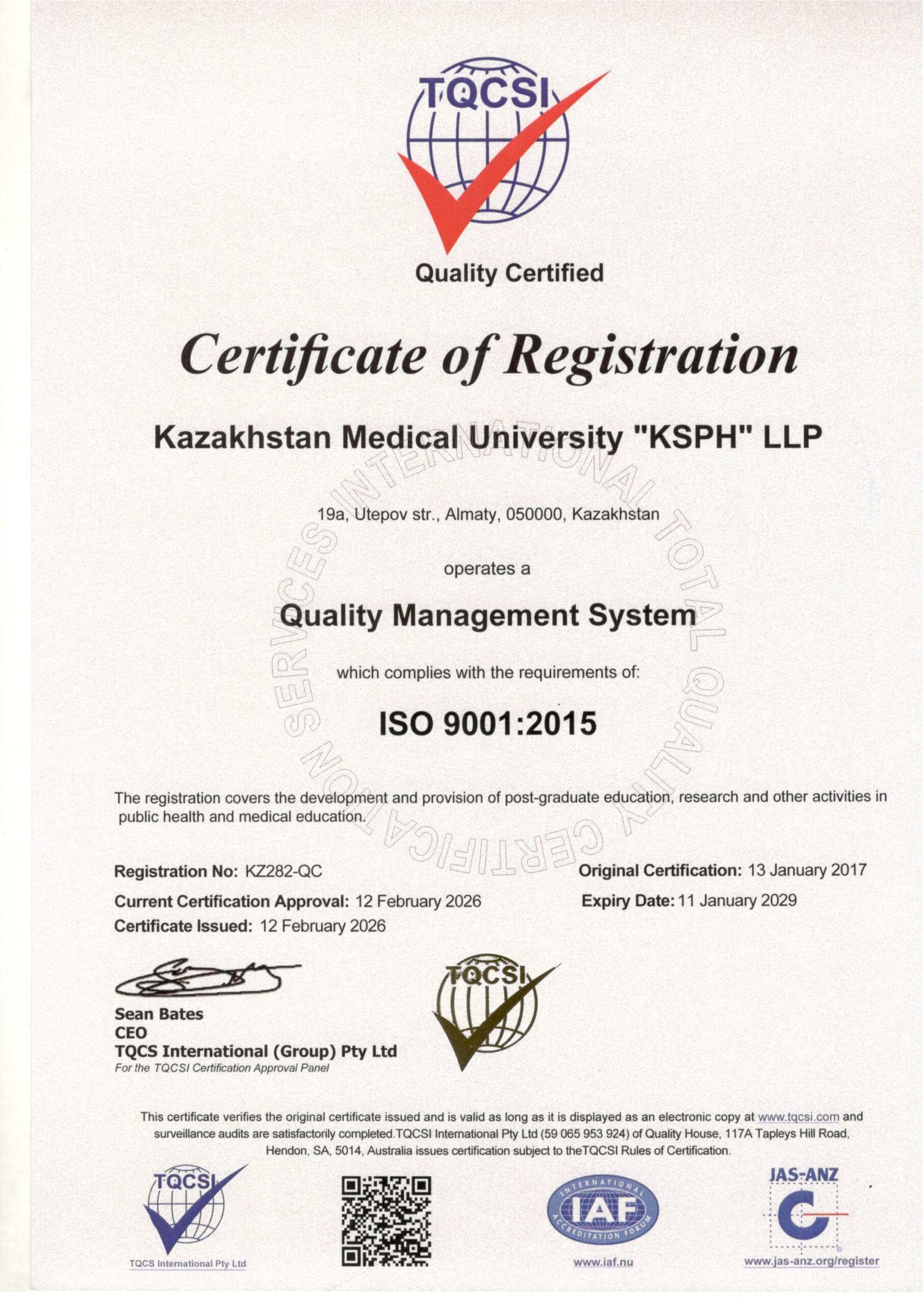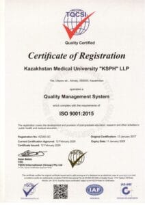 The quality management system of KMU «KSPH», conforming to the international standard ISO 9001:2015, was certified and confirmed by the international certification body – TQCSI company (Kazakhstan) – certificate no. KZ282-QC dated January 13, 2017, recertification dated April 13, 2023.