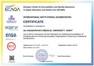 KMU «KSPH» has a license for the right to conduct educational activities in the field of vocational education no. KZ18LAA00006861 dated 21.04.2016 (indefinite), as well as certificates of accreditation: Institutional accreditation IA no. 00035 dated 25.05.2021 – 24.05.2026, Specialized accreditation SA no. 00058-63 dated 25.05.2021 – 24.05.2026.