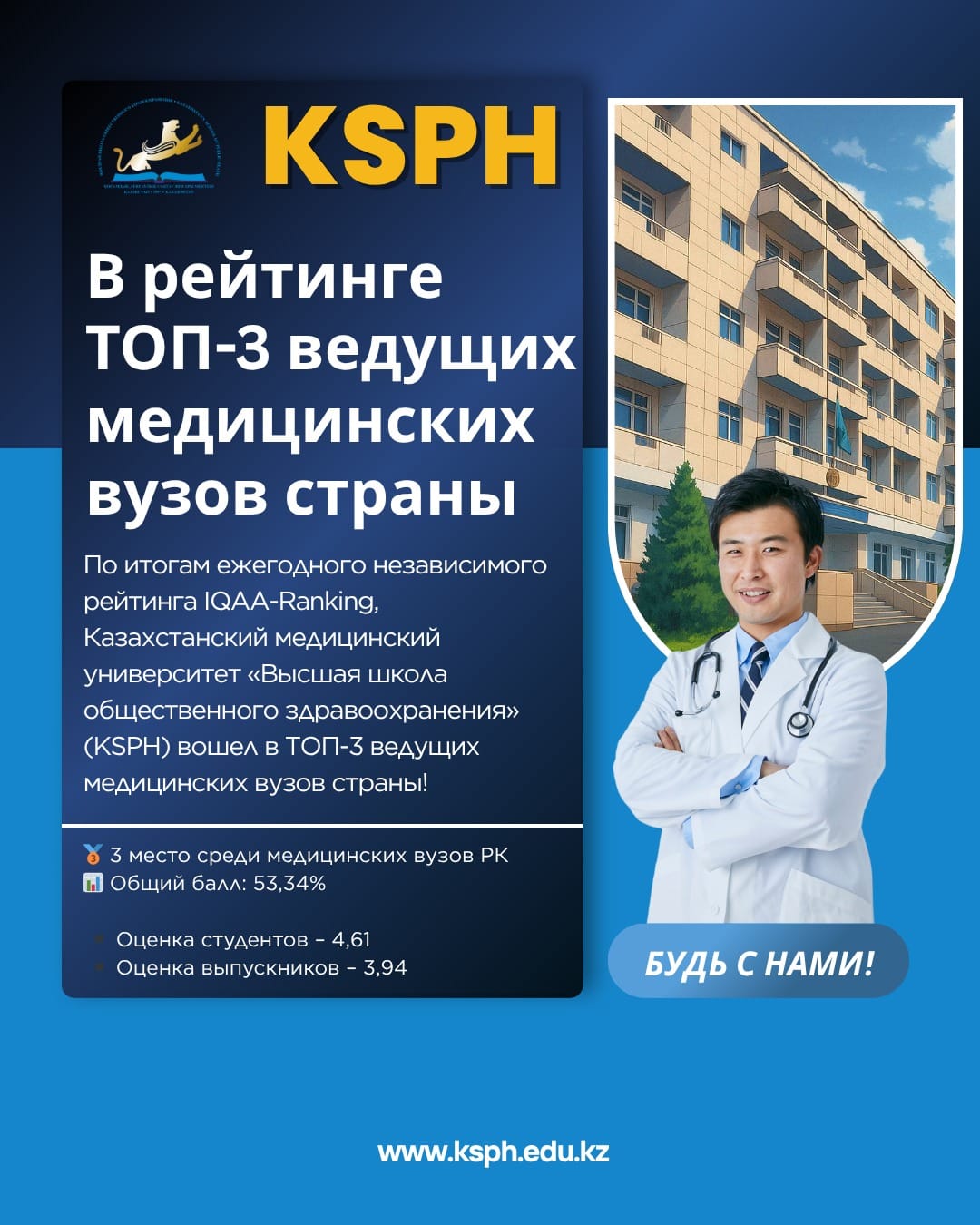 According to the results of the annual independent IQAA-Ranking, the Kazakhstan Medical University "Higher School of Public Health" (KSPH) has entered the TOP 3 leading medical universities in the country! 3rd place among medical universities in the Republic of KazakhstanOverall score: 53.34% Scores by key criteria: ▪️ Academic activity and employment – 36.13▪️ Expert evaluation – 4.28▪️ Employer reputation –…