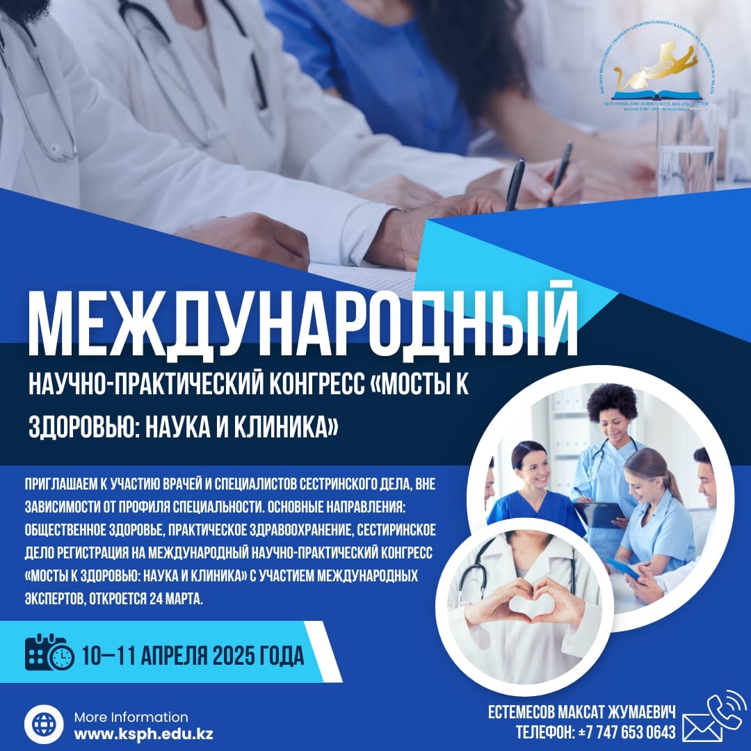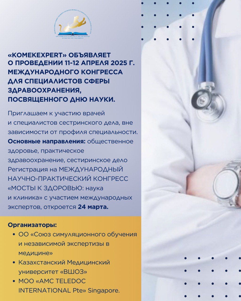 "Komekexpert" invites doctors and nursing professionals to participate in the International Scientific and Practical Congress "BRIDGES TO HEALTH: Science and Clinical Practice," which will take place on April 11–12, 2025, in honor of Science Day. Format: online and offline Organizers: Center for Distance Learning and Independent Medical Expertise "Komekexpert" Kazakhstan Medical University "KSPH" NGO "AMC TELEDOC INTERNATIONAL Pte" (Singapore) Main…