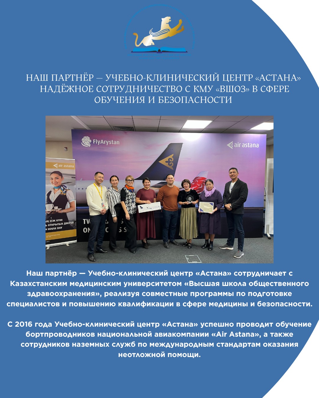 Our partner — the Training and Clinical Center “Astana” — cooperates with the Kazakh Medical University “Higher School of Public Health”, implementing joint programs for the training and professional development of specialists in the field of medicine and safety. Since 2016, the Training and Clinical Center “Astana” has successfully conducted training for flight attendants of the national airline Air Astana,…