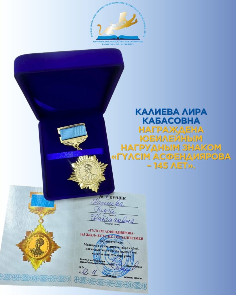 Награда вручена за добросовестный труд в сфере медицины, высокие профессиональные и общественные достижения, а также за значительный вклад в развитие системы здравоохранения Республики Казахстан.