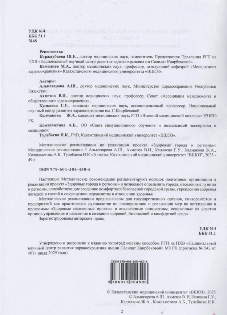 Өз баяндамасында Валихан Исаевич «Салауатты қалалар мен өңірлер» жобасын іске асыру бойынша әдістемелік ұсынымдарды таныстырды. Бұл құжат — халық денсаулығын нығайтуға бағытталған, саларалық өзара іс-қимылды практикалық тұрғыда жүзеге асыруға арналған маңызды стратегиялық және әдістемелік құрал болып табылады.