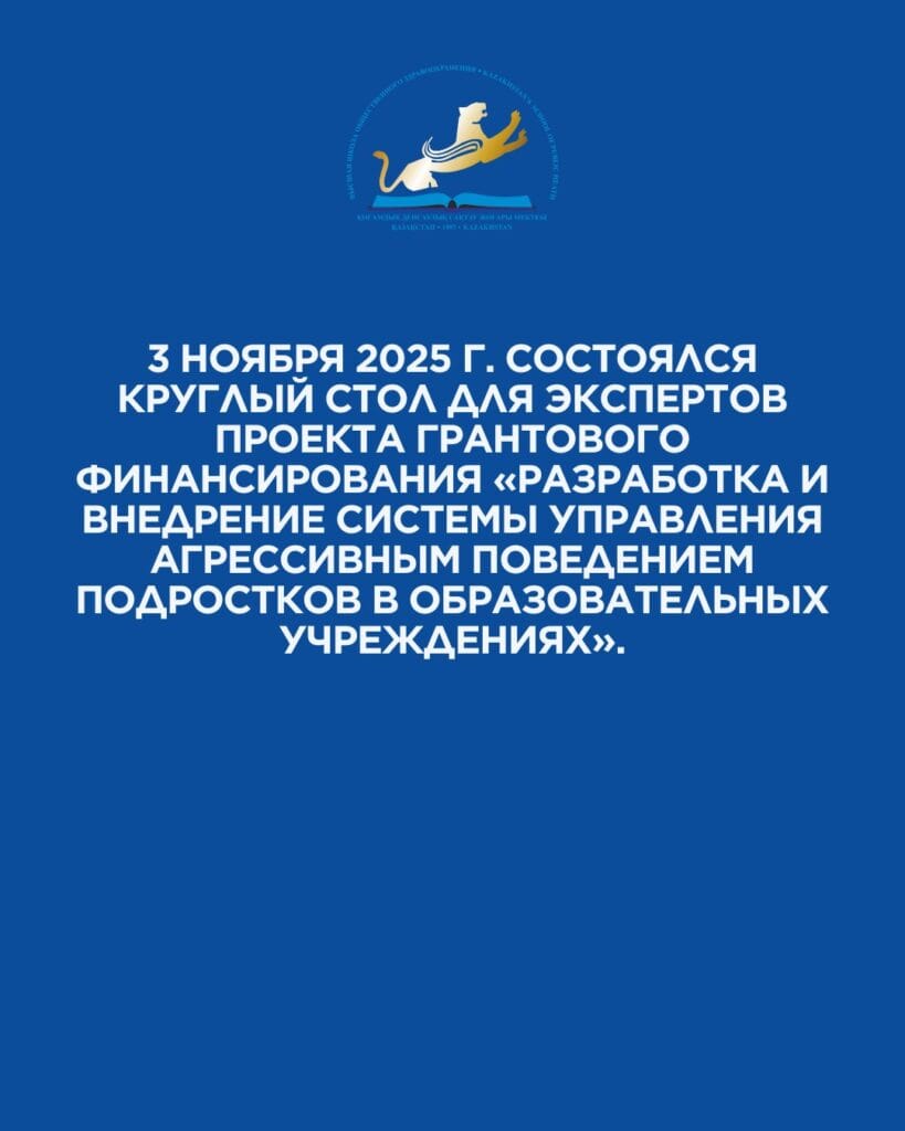 2025 жылғы 3 қарашада «Білім беру ұйымдарында жасөспірімдердің агрессивті мінез-құлқын басқару жүйесін әзірлеу және енгізу» атты гранттық қаржыландыру жобасының сарапшыларына арналған Дөңгелек үстел өтті.