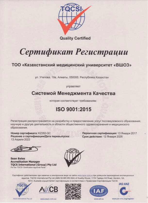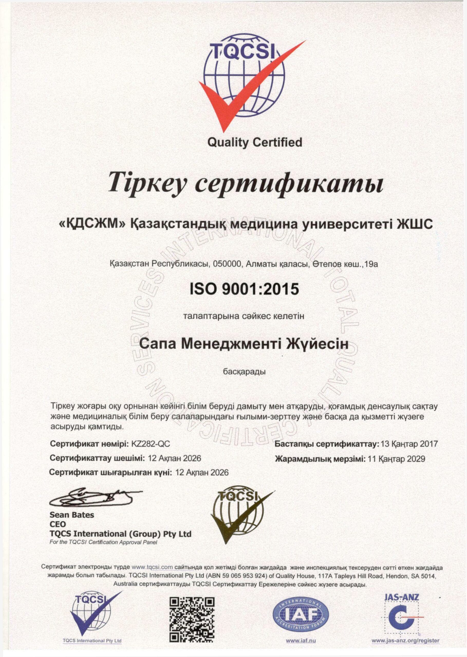«ҚДСЖМ» ҚМУ-нің ISO 9001:2015 халықаралық стандартына сәйкес келетін сапа менеджменті жүйесін сертификаттау жөніндегі халықаралық орган – TQCSI (Қазақстан) компаниясы сертификаттады және растады – сертификат № KZ282-QC 2017 жыл 13 қаңтар, қайта сертификаттау 2023 жыл 13 ақпан.