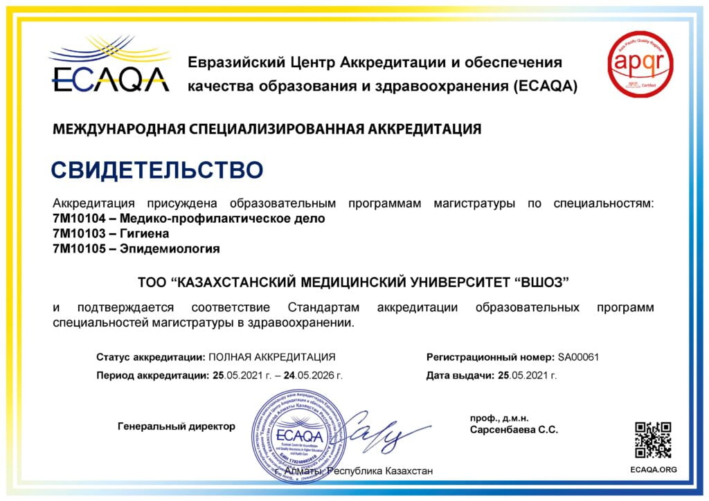 «ҚДСЖМ» Қазақстандық медицина университеті» ЖШС кәсіптік білім беру саласында білім беру қызметін жүргізу құқығына лицензиясы бар № KZ18LAA00006861 (мерзімсіз) 04.2016, сондай-ақ аккредиттеу туралы куәліктерге ие: Институционалдық аккредиттеу IA № 00035 25.05.2021 ж. – 24.05.2026 ж., Мамандандырылған аккредиттеу SA № 00058-63 25.05.2021 ж. – 24.05.2026 ж.