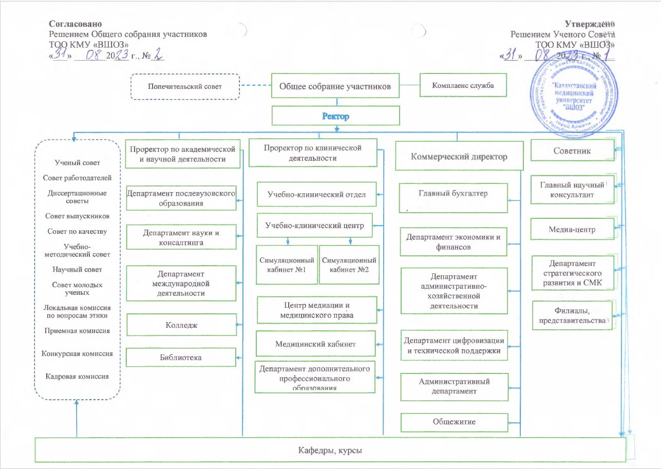 Университеттің құрылымдық ұйымының негізін кафедралар мен ресурстық-ақпараттық орталық құрайды. Кафедралар қызметінің негізгі бағыттары: оқу, ғылыми, халықаралық жобаларға қатысу, сараптамалық және консалтингтік.