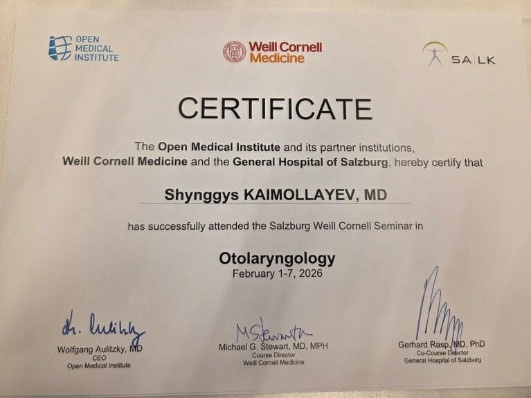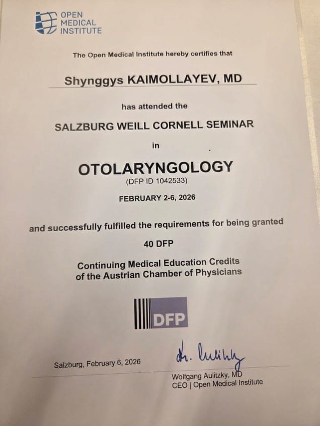 Резидент 2 года обучения Высшей школы общественного здравоохранения Шынгыс Каймоллаев принял участие в престижном международном образовательном семинаре Salzburg Weill Cornell Seminar in Otolaryngology, который проходил 1–7 февраля 2026 года в г. Зальцбург (Австрия).